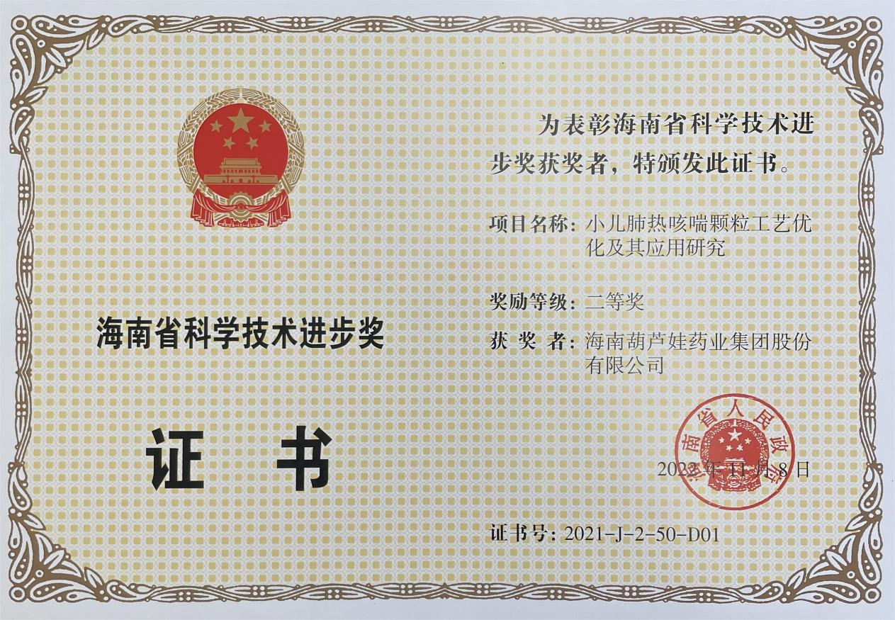 为此,小儿肺热咳喘颗粒的制备方法获得了第二十一届中国专利优秀奖(2019年),专利申请号:ZL201010134951,此次作为专利技术的应用,获得了2021年度海南省科学技术进步奖二等奖。在此之前,币游国际牌小儿肺热咳喘颗粒还多次被授予“临床价值中成药品牌”、“中国连锁药店最具合作价值单品”,荣登“中国医药品牌榜”。
